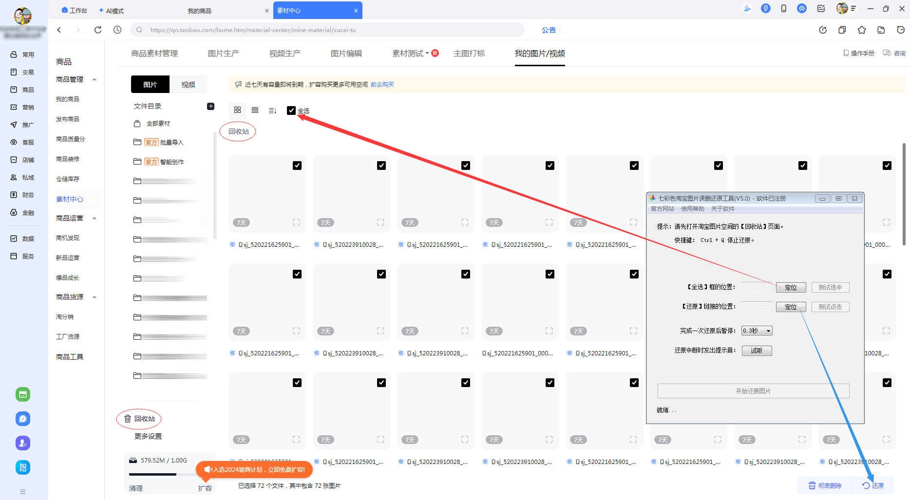 首先打开【淘宝图片空间】的网址:https://qn.taobao.com/home.htm/material-center/mine-material/sucai-tu,然后点击左下角的【回收站】